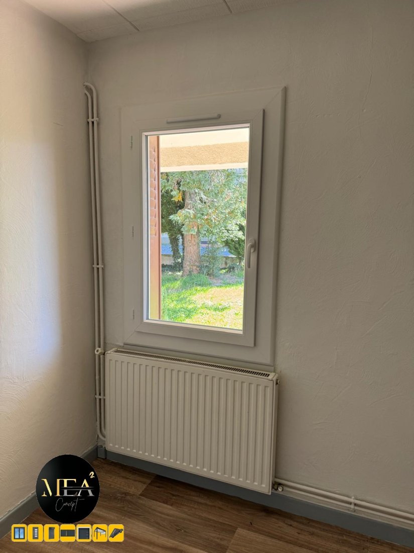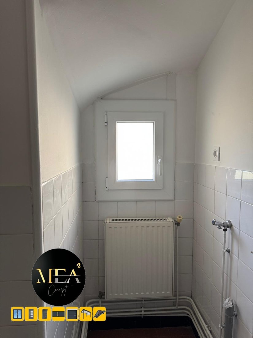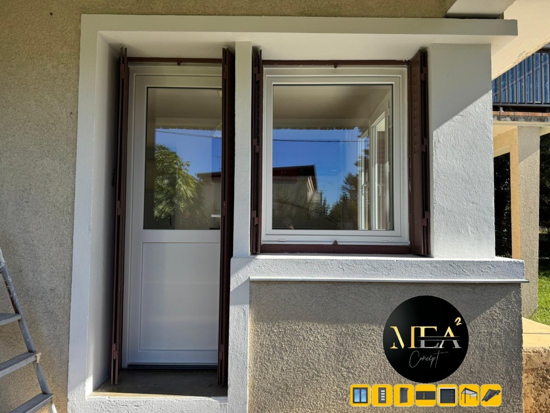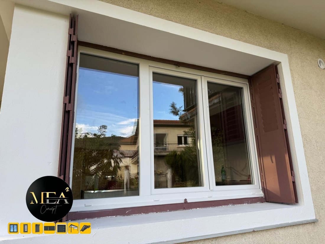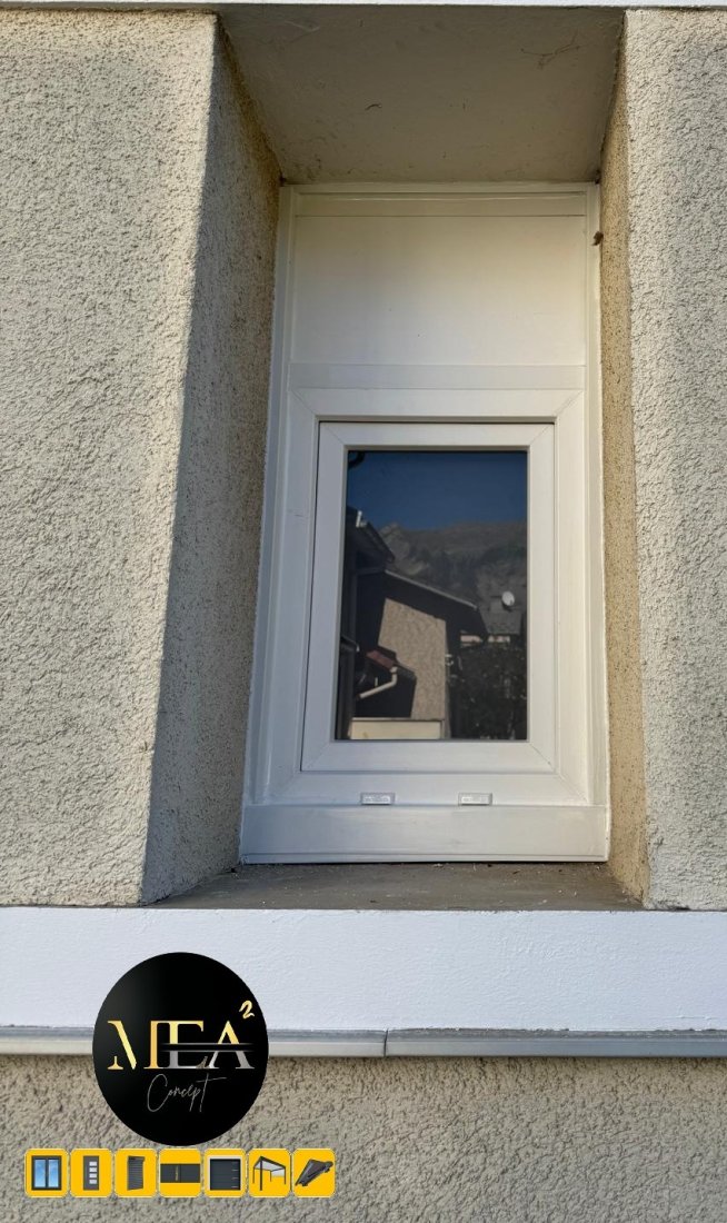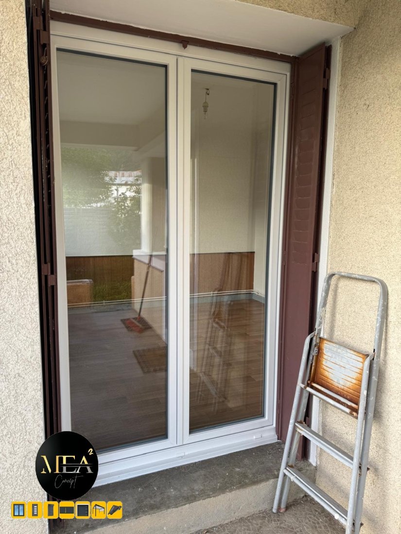 Installation soignée de menuiseries PVC Schüco en rénovation, apportant clarté et isolation à un appartement destiné à la location, avec adaptation sur mesure au-dessus d’une menuiserie en pied d’escalier.