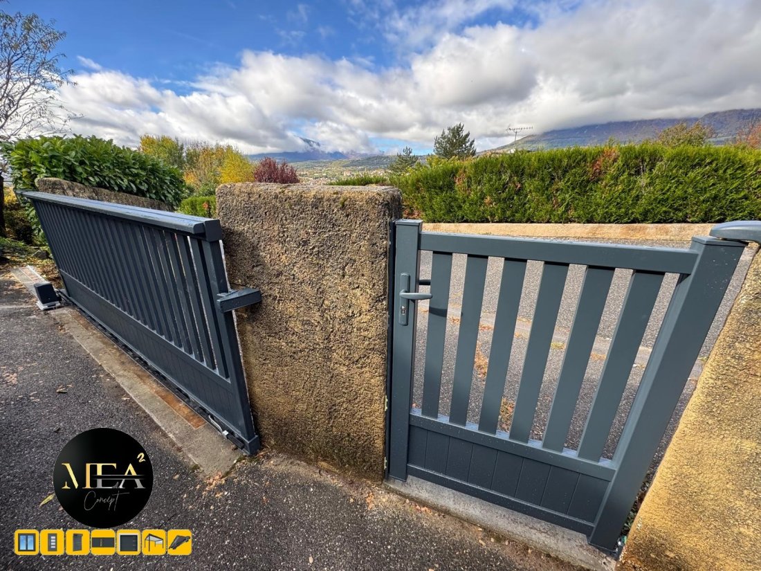 Pose d’un portail coulissant motorisé en aluminium et portillon assorti à Gap par MEA² Concept : une entrée élégante, moderne et sécurisée, parfaitement intégrée dans un cadre résidentiel avec vue sur les montagnes.